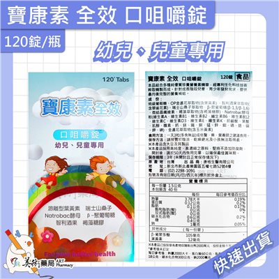 寶康素全效 口咀嚼錠 120錠/瓶 幼兒 兒童專用 游離型葉黃素 褐藻糖膠 瑞士山桑子 美術藥局 公司貨